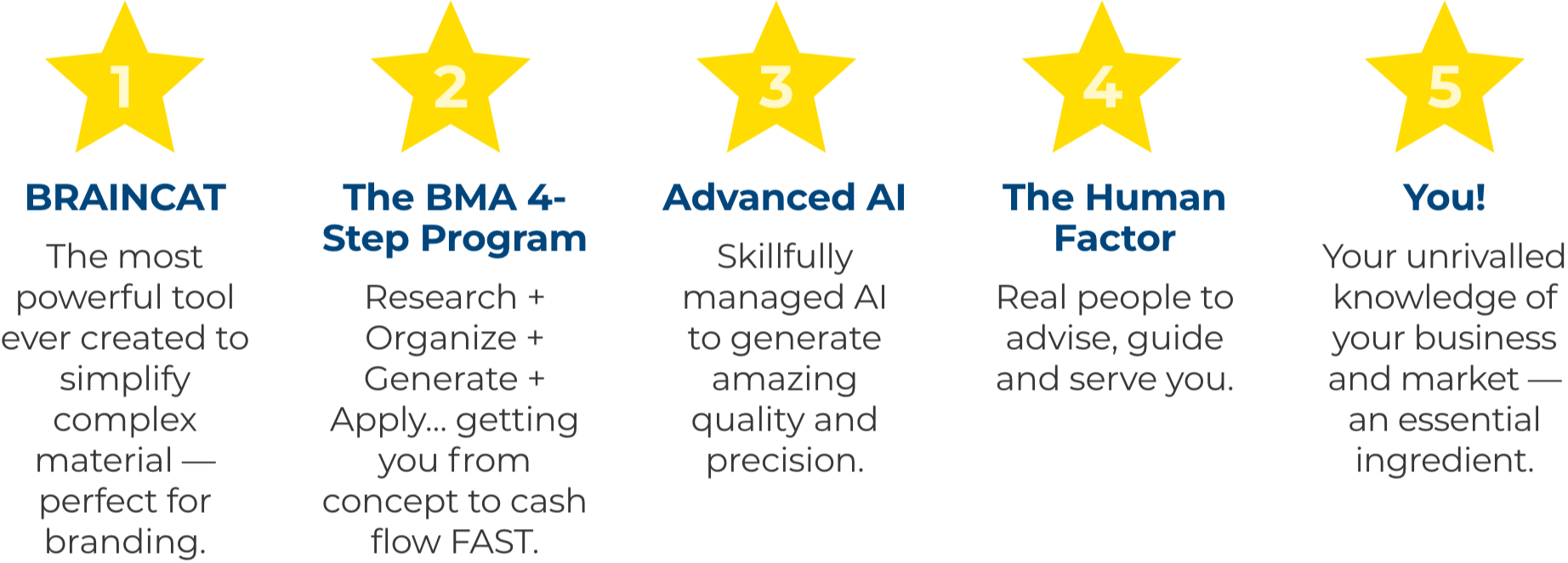 Here’s our formula to create a knockout brand QUICKLY: the power of AI plus the essential human factor. BRAND MASTER AI is the first and only complete branding program with this unique approach.