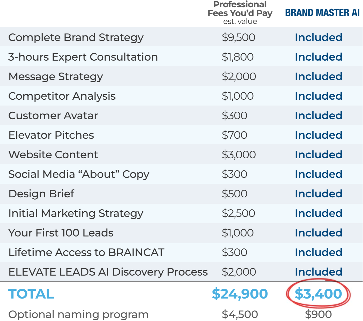 BRAND MASTER AI delivers a complete brand platform at a fraction of the cost you'd pay to a top professional consultant.